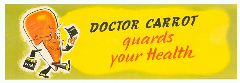 Ändå ser de tre morotsgnagarna rätt nöjda ut, kanske för att den hemodlade moroten smakar gott eller för att de räknar med att förbättra sitt mörkerseende. Det brittiska matministeriets propaganda under andra världskriget var lika kreativ som effektiv och spred bland annat idén att det var för att stridspiloterna åt sådana mängder morötter som de lätttare kunde skjuta ner de tyska bombplanen i natten. För de vuxna gjorde ministeriet den trögtuggade krigslimpan mer attraktiv med hjälp av ryktet att limpan hade en potenshöjande effekt.